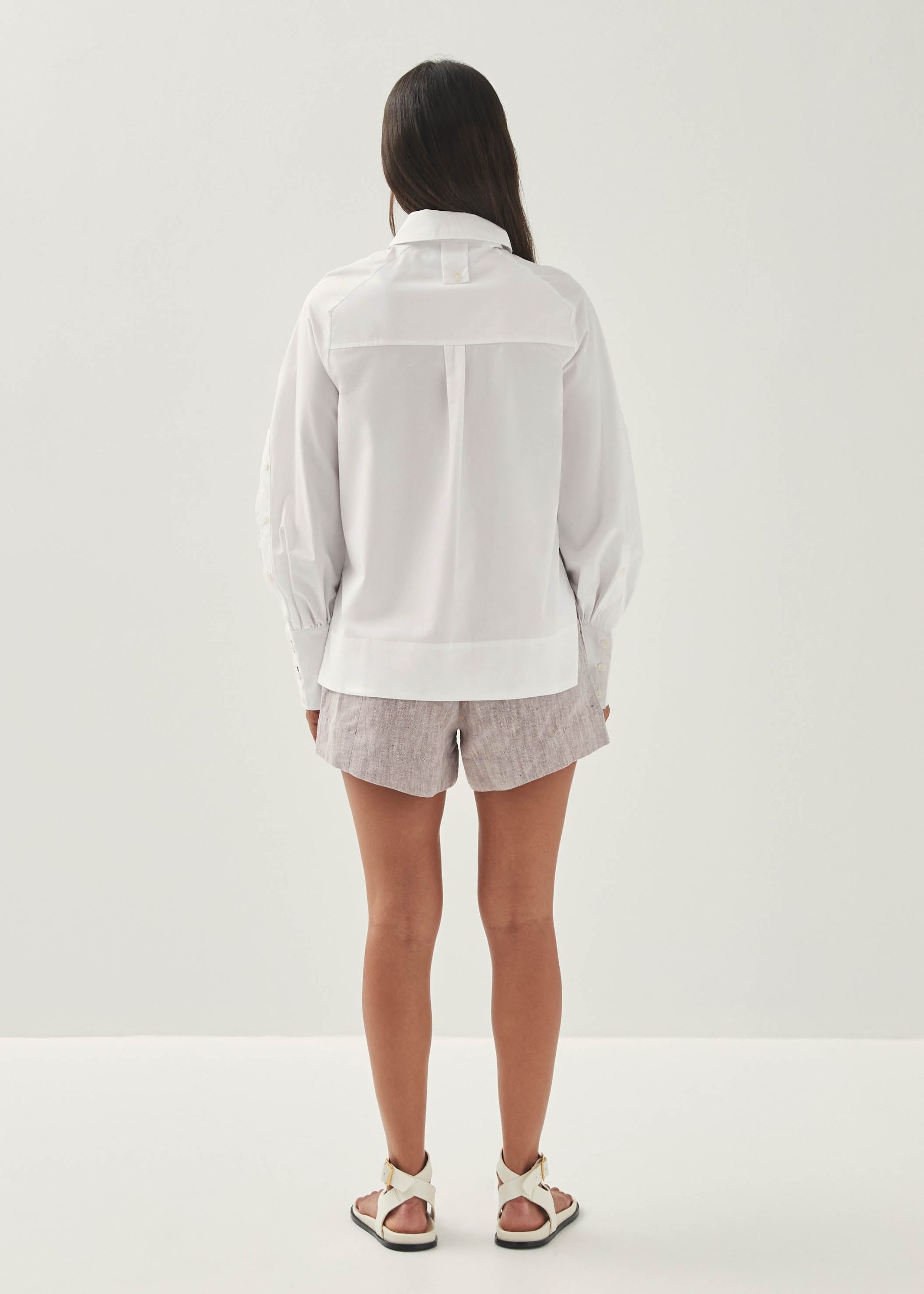 A classic. reinvented. Buttoned from the bottom of its puff sleeve to the neck. the Aiko white poplin shirt features a wide fit and a distinctive design. offering a fresh take on a timeless essential.